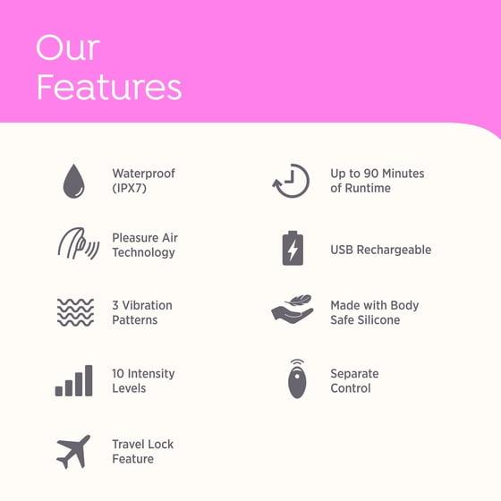 - 2 Button Control - Easily switch between pleasure air intensity and vibration levels with the 2-button control