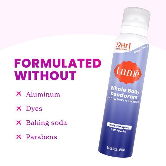Lume Whole Body Deodorant for Women, Spray Deodorant, Aluminum Free, Soft Powder, 3.6 oz