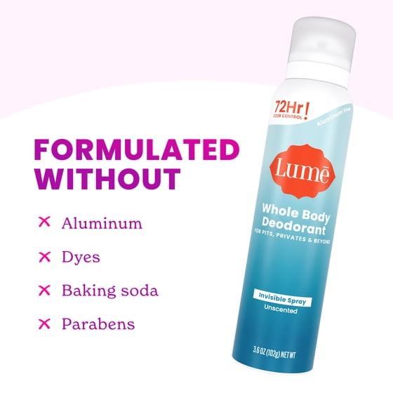 Lume Whole Body Deodorant for Women, Spray Deodorant, Aluminum Free, Unscented, 3.6oz