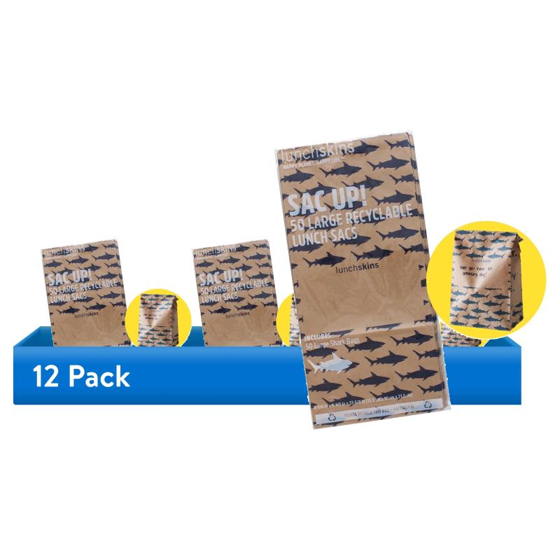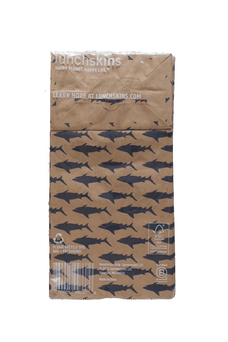 (12 pack) Lunchskins Compostable Large Paper Lunch Sacs – 50 Pack | Brown Kraft Paper Bags with Shark Print & Note Area | Eco-Friendly Lunch, Snack, and Treat Bags