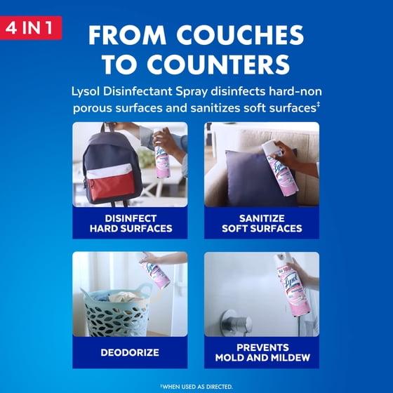 - DISINFECTING AND SANITIZING SPRAY: Lysol disinfects hard non-porous contact surfaces and sanitizes soft surfaces. This multi-purpose spray can be used in the home and kitchen, to disinfect kids toys, couches, counters , bathrooms, and over 100 more surfaces.