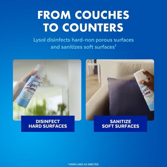 - DISINFECTING AND SANITIZING SPRAY: Lysol disinfects hard non-porous contact surfaces and sanitizes soft surfaces. This multipurpose spray can be used in the home and kitchen, to disinfect toys, couches, counters, bathrooms, and over 100 more surfaces.