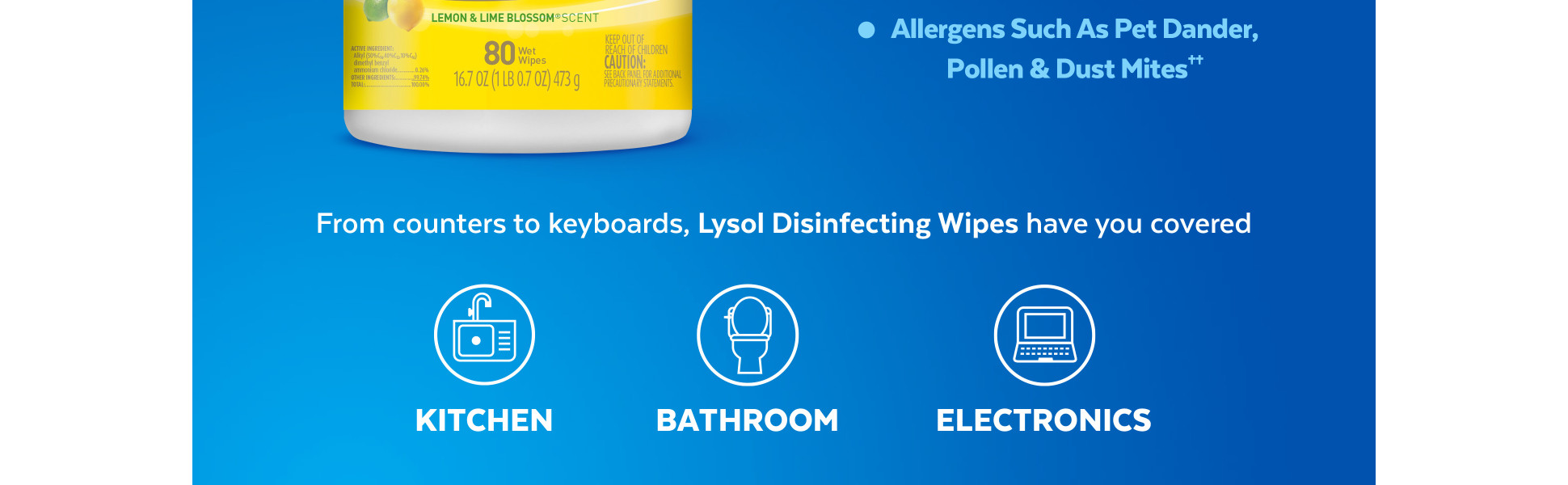 - LYSOL WIPES: This Lysol wipe is essential for surface sanitization! Perfect for disinfecting bathrooms, classrooms, and public transportation. Tested and proven to eliminate 99.9 percent of viruses and bacteria*