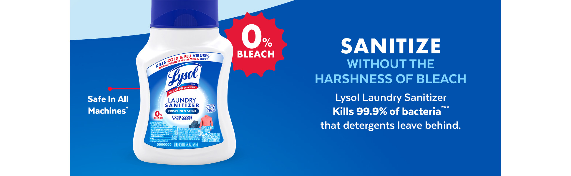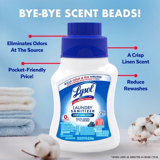 - CONTAINS 0% BLEACH, GENTLE ON FABRICS: Bleach and Phosphate free. Gentle on most fabrics, including whites and colors. Can be used in cold water. Leaves your clothes smelling of fresh linen EASY TO USE, WORKS IN ALL STANDARD & HE MACHINES: Add to the Fabric Softener compartment or during the rinse cycle to sanitize laundry and eliminate odor causing bacteria. LEADERS IN DISINFECTION: Looking for some of our other great disinfectant products? Try our Lysol Disinfecting Wipes, Lysol Disinfectant Sprays and Lysol All Purpose Cleaners.