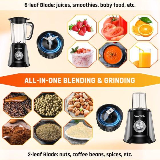 - 1000W High-Power Motor & Two Multifunctional Blades: With up to 30,000 RPM, this 1000W countertop blender crushes ice, fruits, and veggies easily. VAVSEA smoothie machine comes with two stainless steel blades: an upgraded, thicker 6-blade design for smoothies, shakes, and baby food, and a 2-blade grinder for coffee beans, nuts, and spices.