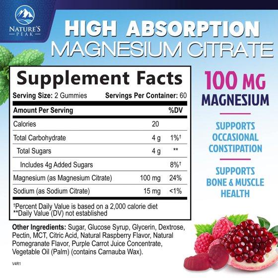 - VEGAN MAGNESIUM CITRATE GUMMIES BY NATURE'S PEAK: With our high absorption formula provide natural calm support for adults, women, men, and kids; These magnesio mineral gomitas have magnesium citrate in place of glycinate, oxide, malate, and threonate for muscle, bone, and nerve health support; extra strength chewable supplement