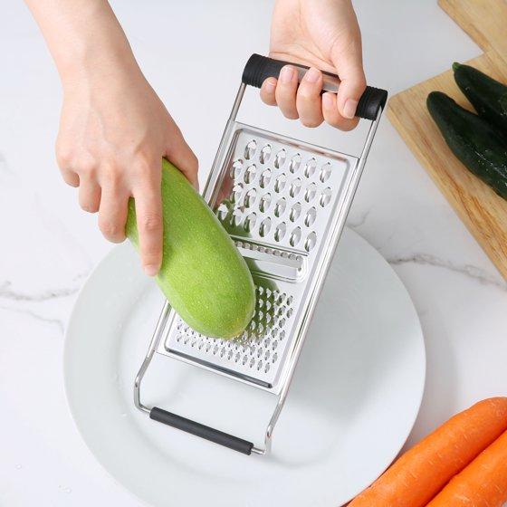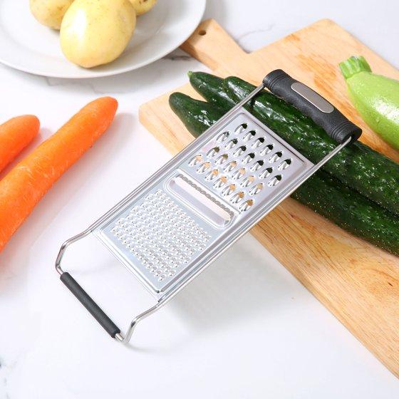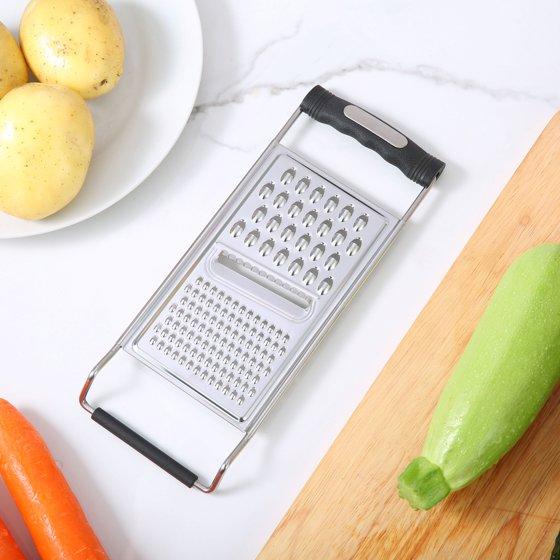 - Triple section stainless steel flat grater offers fine, medium, and coarse grating surfaces for versatile food preparation with cheese, vegetables, chocolate and more.