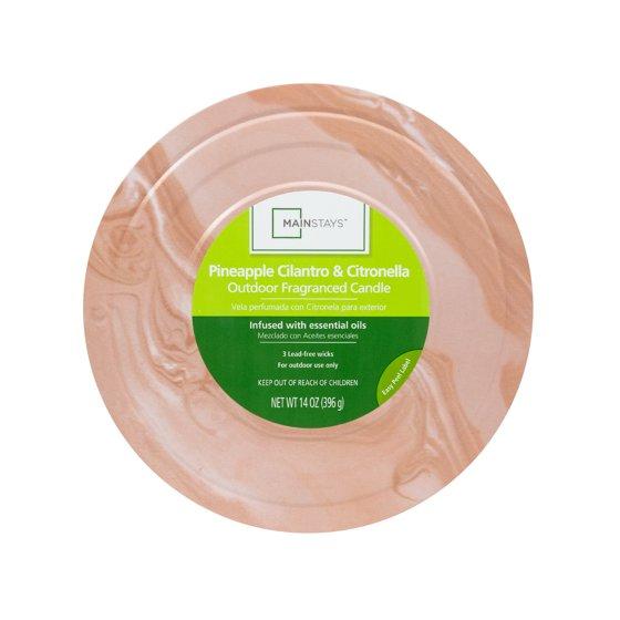 Elevate every outdoor moment with the Mainstays 14 oz Pineapple Cilantro & Citronella Outdoor Fragranced Candle. This trendy outdoor citronella candle features all-natural citronella oil and three cotton lead-free wicks for a generous burn time of up to 40 hours. The scent is a delightful fusion of sweet citrus, fresh herbs, pineapple, creamy, vanilla bean, musk, and tonka, creating a cozy, inviting atmosphere. Housed in a charming terracotta tin, this candle adds an earthy, tropical flair to any outdoor setting. Whether you're hosting a garden party, unwinding with a book on the porch, or gathering friends for an al fresco dinner, this candle adds a natural touch to any outdoor occasion. Keep your adventures well-lit, fragrant, and peaceful with the Mainstays 14 oz Pineapple Cilantro & Citronella Outdoor Candle. *Citronella candles are made for outdoor use only. Do not use it in any enclosed areas to prevent fire or injury.