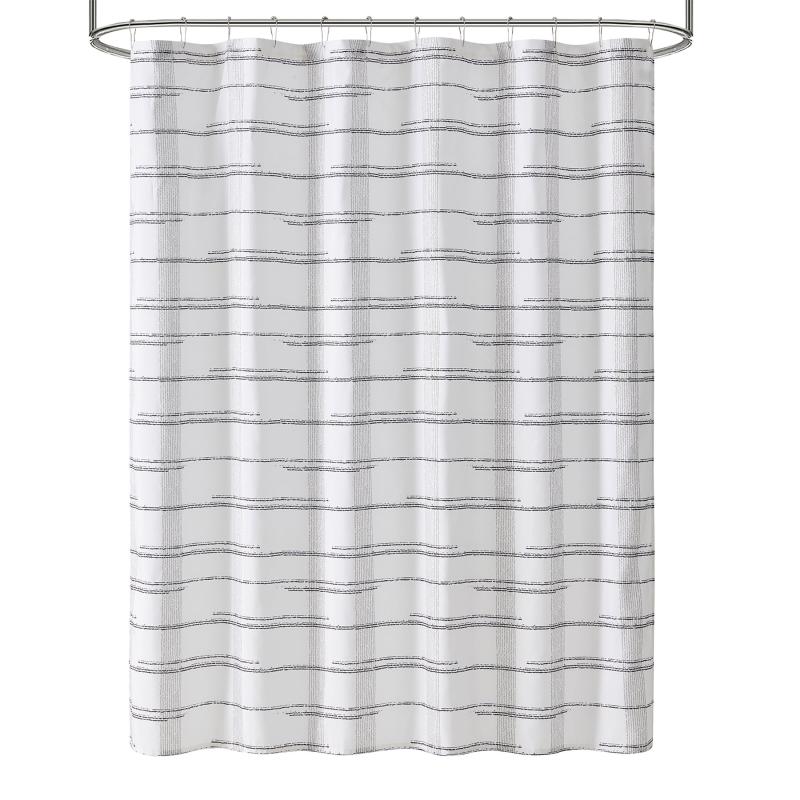 - Shower curtain features embossed striped patterns