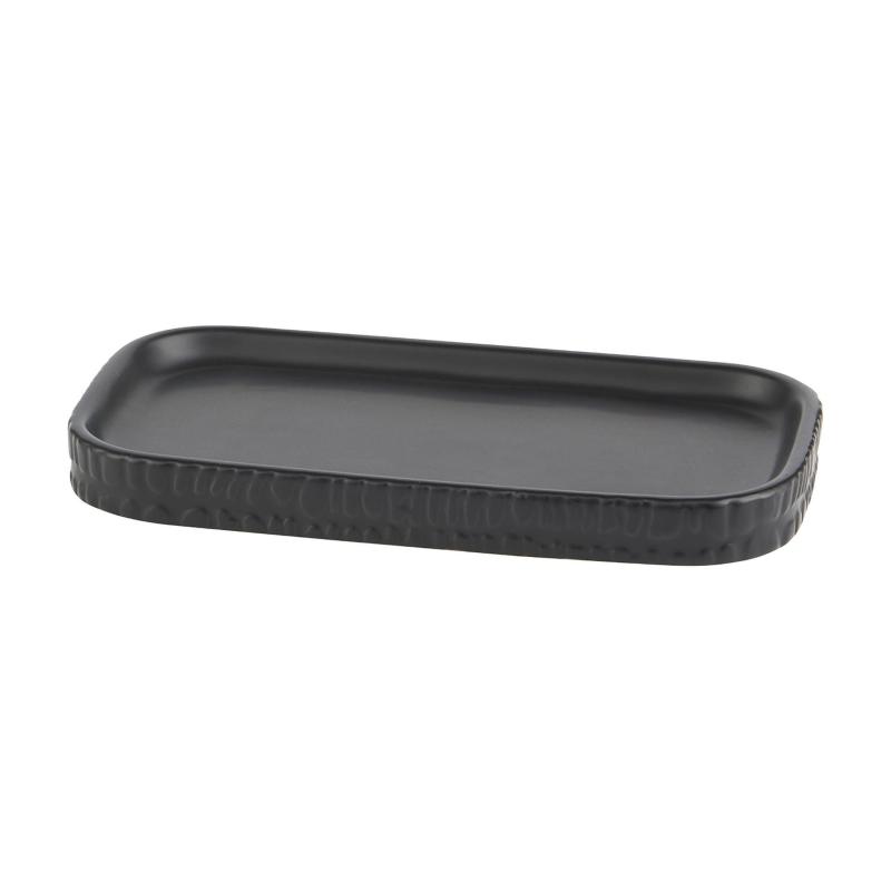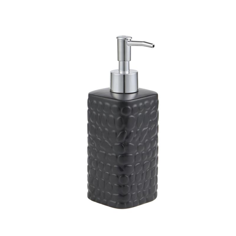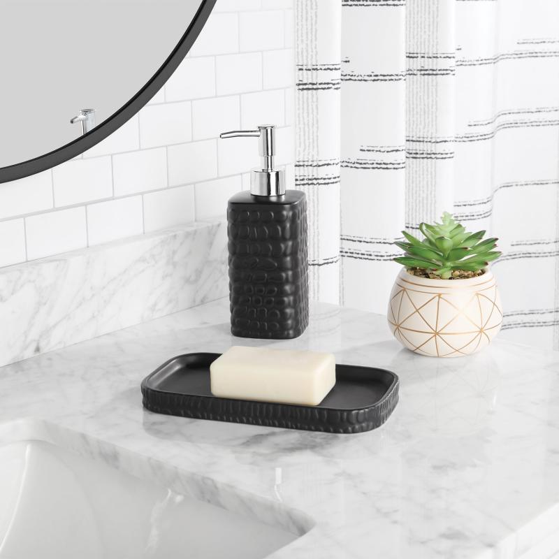 - Black ceramic soap tray and pump dispenser with textured pebble design