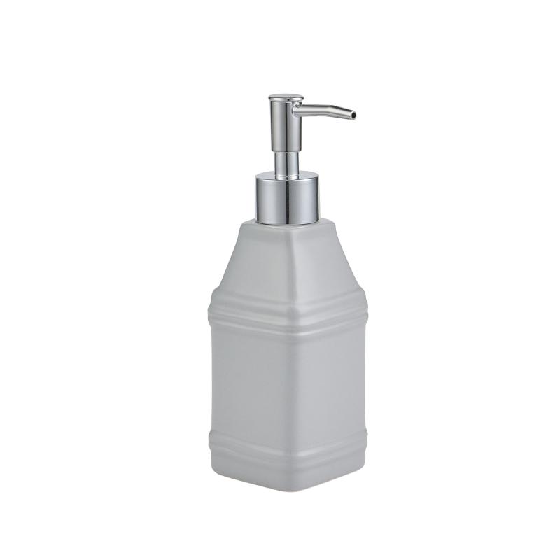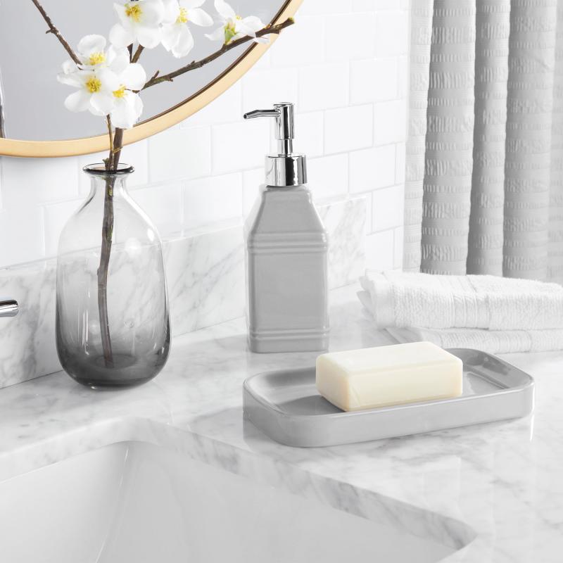 - Patterned glass soap tray and pump dispenser
