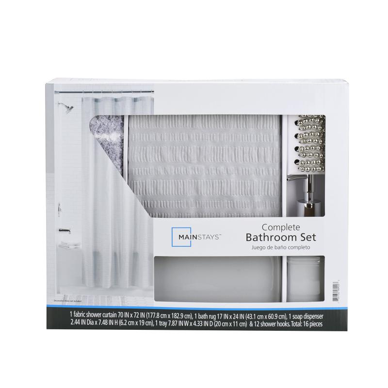 Mainstays 16-Piece Bathroom Shower Curtain Set – Soft Silver Fabric Curtain with Coordinated Bath Rug, Soap Pump & Tray
