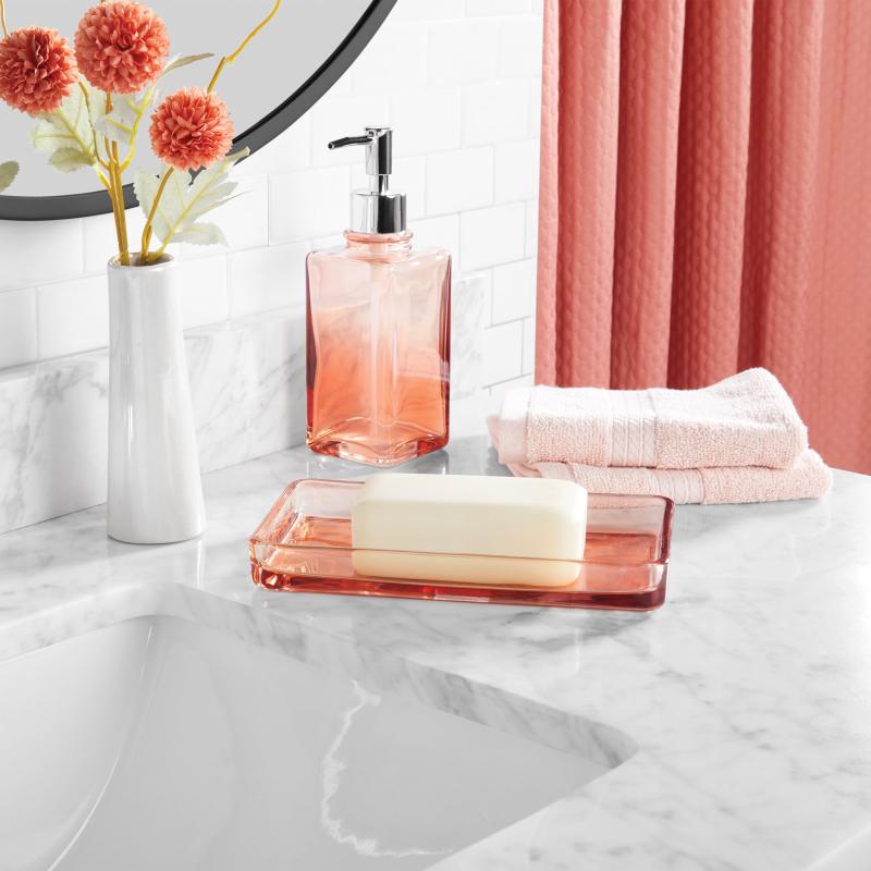 - Material details - Shower curtain and bath rug: 100% polyester, Soap pump and tray: Glass