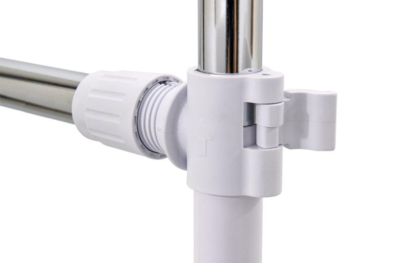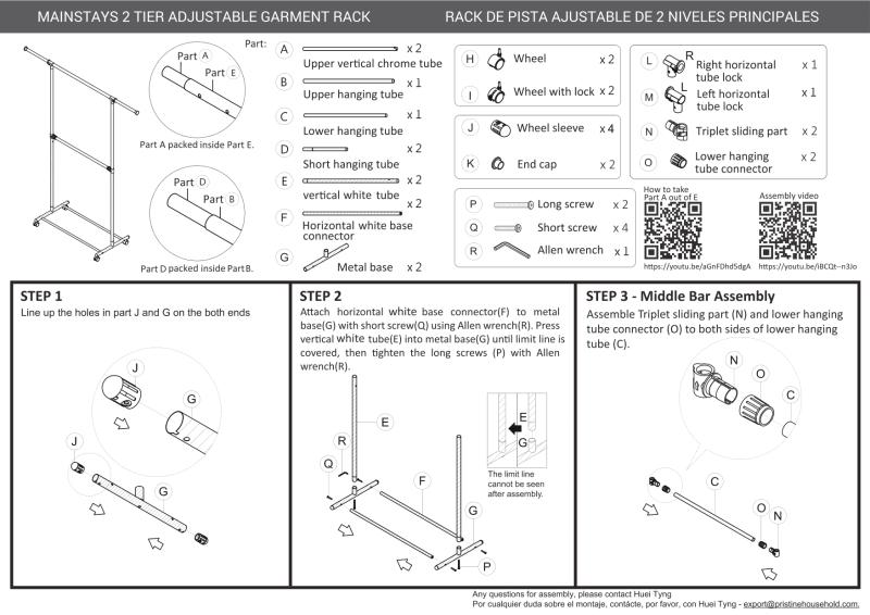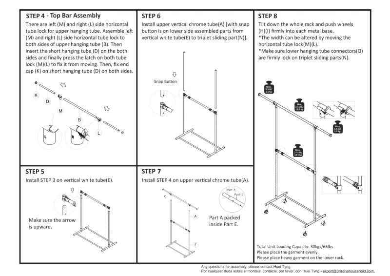 #1 Line up the holes in part (J) and (G) on the both ends; #2 Attach horizontal white base connector (F) to metal base (G) with short screw (Q) using Allen wrench (R). Press vertical white tube (E) into metal base (G) until limit line is covered, then tighten the long screws (P) with Allen wrench (R); #3 Assemble triplet sliding part (N) and lower hanging tube connector (O) to both sides of lower hanging tube (C); #4 There are left (M) and right (L) side horizontal tube lock for upper hanging tube. Assemble left (M) and right (L) side horizontal tube lock to both sides of upper hanging tube (D) on the both sides and finally press the latch on both tube lock (M)(L) to fix it from moving. Then fix end cap (K) on short hanging tube (D) on both sides; #5 Install Step 3 on vertical white tube (E); #6 Install upper vertical chrome tube (A) [with snap button is on lower side assembled parts from vertical white tube (E) to triplet sliding part (N)]; #7 Install Step 4 on upper vertical chrome tube (A); #8 Tilt down the whole rack and push wheels (H)(I) firmly into each metal base. *The width can be altered by moving the horizontal tube lock (M)(L). *Make sure lower hanging tube connectors (O) are firmly lock on triplet sliding parts (N).