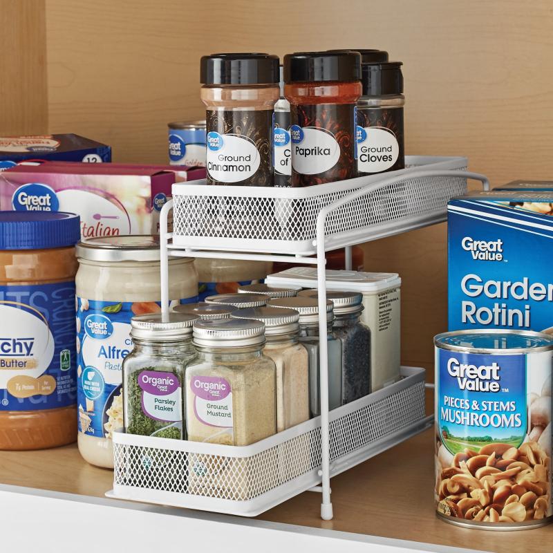 Mainstays 2-Tier Sliding Spice Organizer Rack, Pull-Out Cabinet and Pantry Spice Storage Rack for Kitchen Organization, 4.5" x 11", White