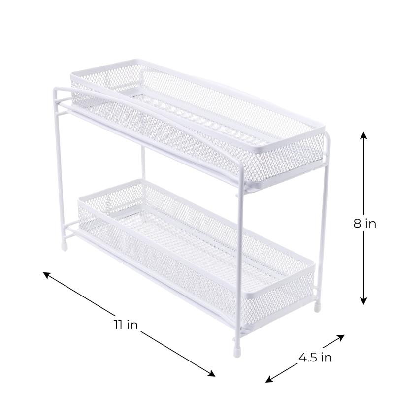 Featuring white steel mesh baskets connected to a matching white steel frame, this spice organizer offers style on top of functionality. Its two drawers are designed to pull out from the rack, providing quick and convenient access to your most used seasonings and keeping them concealed in a more compact space when not in use. You can even bring one of these organizers into the bathroom to keep your lotions, cleansers, wipes, and other hygienic items all in one place, or put one in your craft room to keep all your threads, brushes, and paints together.
