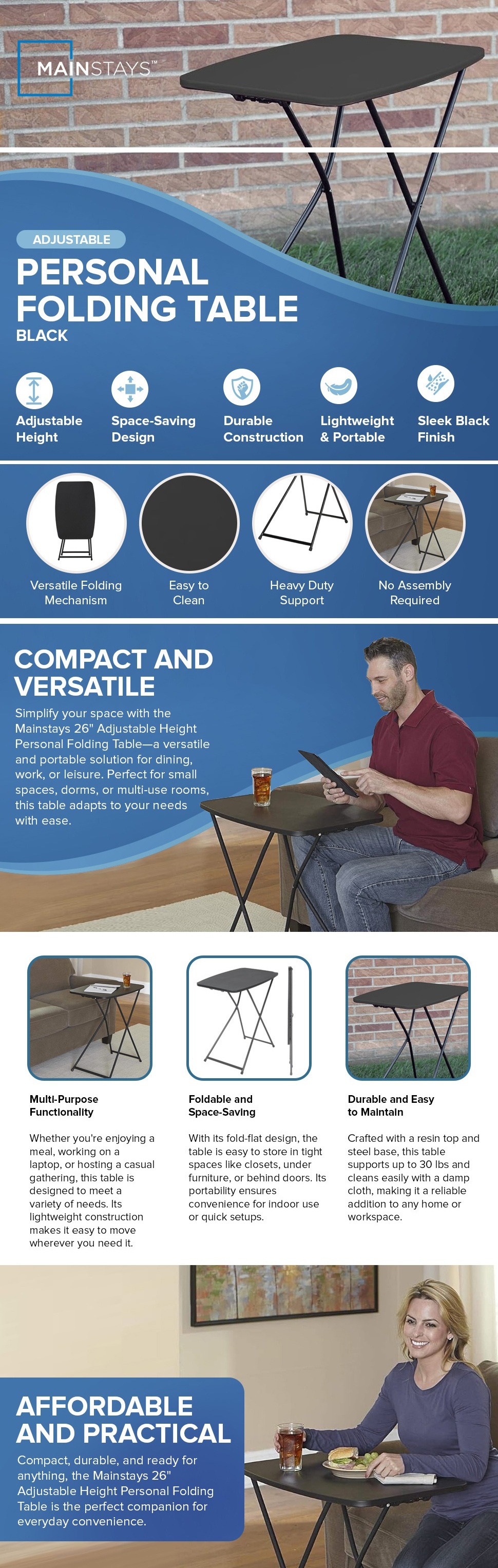 The Mainstays 26" Adjustable Height Personal Folding Table is suitable for a variety of uses. It is great for eating your meals in front of the television or for using as a small workstation. It can also be used for holding snacks and food when you have courtyard or patio parties. This multi-purpose table can be folded flat for easy storage in a closet, under a couch, or behind a chair. This versatile living room folding table cleans easily and is lightweight and portable. Need extra workspace in your Dorm Room? The Mainstays 26" Personal table is the perfect solution. For added convenience, this lightweight folding table does not require any assembly.