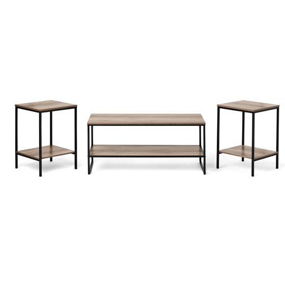 Mainstays 3 Piece Coffee and End Table Set with Rustic Brown Finish and Black Metal Frame