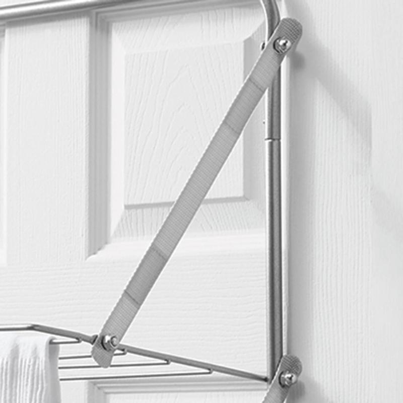 - Practical, stylish over-the-door towel rack provides a smart storage and organization solution for bathroom towels