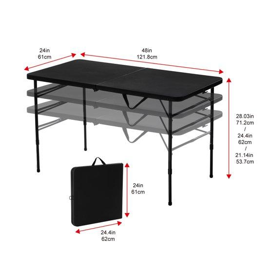 Provide all of the table spaces that you need in all kinds of settings with the Mainstays 4' Fold-in-Half Adjustable Table in Rich Black. This versatile rectangular table is sturdy and durable, made with reliable materials, and folds for easy storage and transportation. When you're finished using it, just fold in the metal legs, fold the table in half, and your new compact table is ready for transport! Its classic black color is sure to fit in at any gathering in any setting, and its spacious expanded 48" long table-top is ideal for holding a wide variety of foods, crafts, or whatever items you are working with! It's great for everyday use both indoor and outdoor, as a serving table, craft supply table, outdoor meal table, or for whatever purposes you may need. The plastic tabletop is easy to clean with no fuss just wipe it down with a damp cloth, and it will look as good as new! The carrying handle makes it perfect for taking on the go, for outdoor barbecues, game nights, school activities, parties, or tailgating events. The table comfortably seats 4 adults, so all of your friends and family can be included.