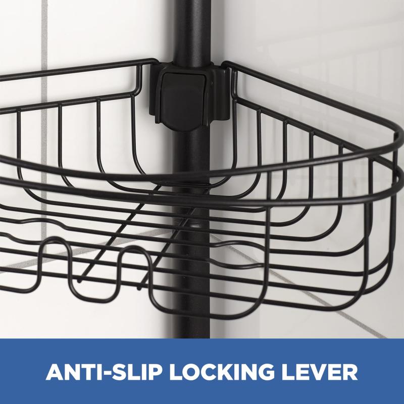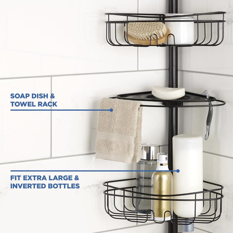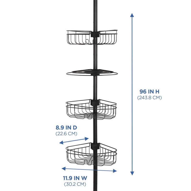 - Pole caddy includes 3 adjustable deep storage baskets, plus a soap tray shelf with towel bar