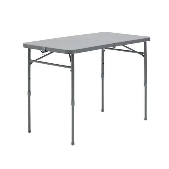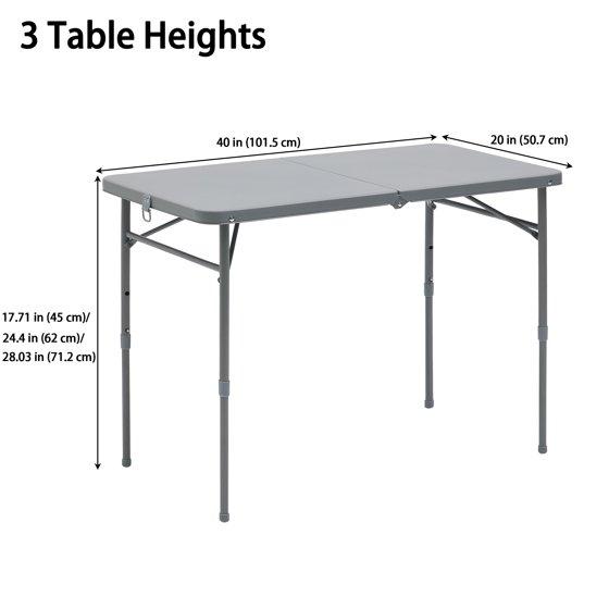 Provide all of the table spaces that you need in all kinds of settings with the Mainstays 40" Fold-in-Half Table. This versatile rectangular table is sturdy and durable, made with reliable materials, folds for easy storage and transportation, and adjusts to three different heights. When you're finished using it, just fold in the metal legs, fold the table in half, and your new compact table is ready for transport! Its classic color is sure to fit in at any gathering in any setting, and its spacious expanded 40" long table-top is ideal for holding a wide variety of foods, crafts, or whatever items you are working with! It's great for everyday use both indoor and outdoor, as a serving table, craft supply table, outdoor meal table, or for whatever purposes you may need. The plastic tabletop is easy to clean with no fuss just wipe it down with a damp cloth, and it will look as good as new! The carrying handle makes it perfect for taking on the go, for outdoor barbecues, game nights, school activities, parties, or tailgating events. The tabletop is large enough to be able to sit the whole group down around the table, so all of your friends and family can be included.
