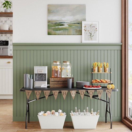 Provide all of the tablespaces that you need in all kinds of settings with the Mainstays 72" Fold-in-Half Table in Rich Black. This versatile rectangular table is sturdy and durable, made with reliable materials, and folds for easy storage and transportation. When you're finished using it, just fold in the metal legs, fold the table in half, and your new compact table is ready for transport! Its classic black color is sure to fit in at any gathering in any setting, and its spacious expanded 72" long table-top is ideal for holding a wide variety of foods, crafts, or whatever items you are working with! It's great for everyday use both indoor and outdoor, as a serving table, craft supply table, outdoor meal table, or for whatever purposes you may need. The plastic tabletop is easy to clean with no fuss - just wipe it down with a damp cloth, and it will look as good as new! The carrying handle makes it perfect for taking on the go, for outdoor barbecues, game nights, school activities, parties, or tailgating events. The tabletop is large enough to be able to sit the whole group down around the table, so all of your friends and family can be included.