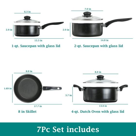 - Includes a 1 Qt. saucepan with lid, 2 Qt. saucepan with lid, 4 Qt. Dutch oven with lid, and an 8-inch frying pan