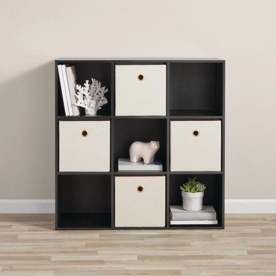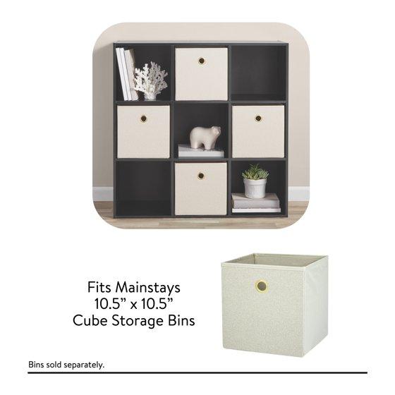 The Mainstays 9-Cube Storage Organizer features nine compartments perfectly sized for storing and displaying office supplies, books, clothes, craft supplies, photos, collectibles and so much more! Compatible with Mainstays 10.5" x 10.5" collapsible storage bins (sold separately) and available in multiple finishes. Four open-back cube shelves make managing cords and cables easy, while five closed-back shelves help keep items securely housed. Add an accent piece that is both functional and stylish to your living room, family room, home office, playroom, closet and more, with the Mainstays 9-Cube Organizer.