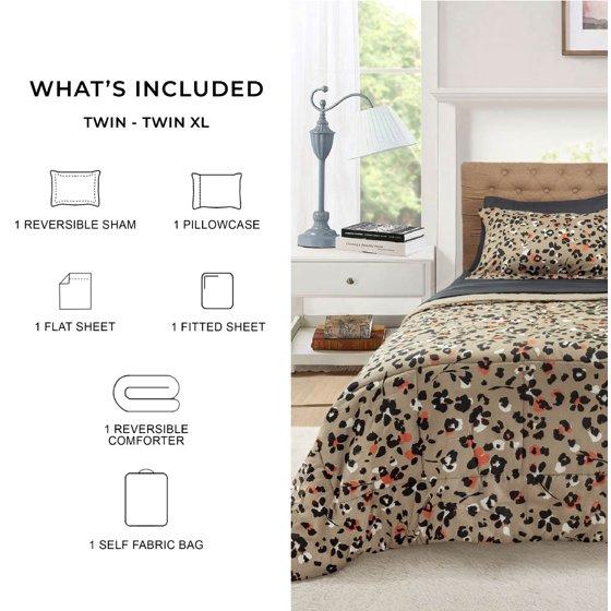 - Mainstays 5 Piece Reversible Bed in a Bag Comforter Set with Sheets, Beige Animal Print, Twin-XL
