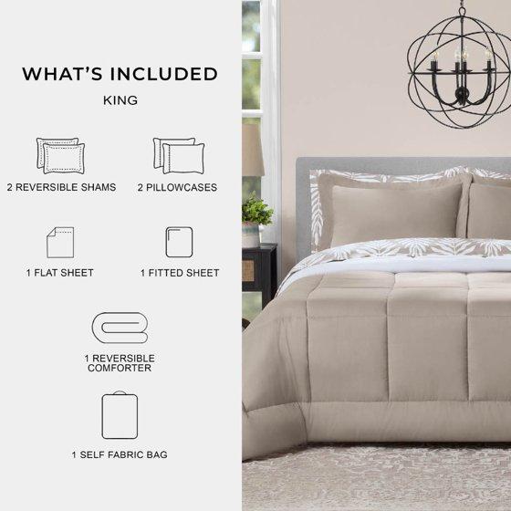- Mainstays 7 Piece Reversible Bed in a Bag Comforter Set with Sheets, Beige Palm, King