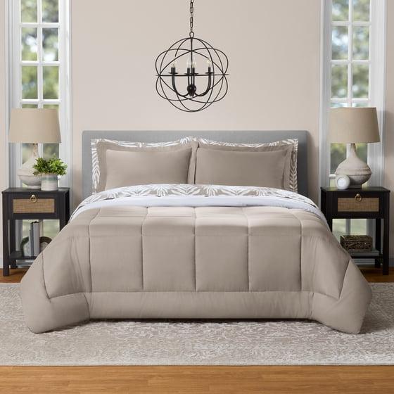 Mainstays All in One Reversible Comforter and Sheet Set- 7 Piece, King, Beige Palm