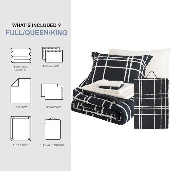 Mainstays All in One Reversible Comforter and Sheet set- 7 Piece, Queen, Black and White Checker