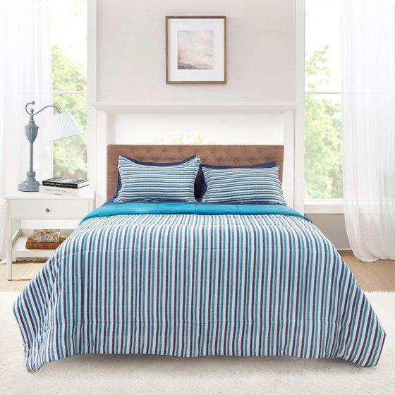 - Mainstays 7 Piece Reversible Bed in a Bag Comforter Set with Sheets, Blue and White Stripe, Full