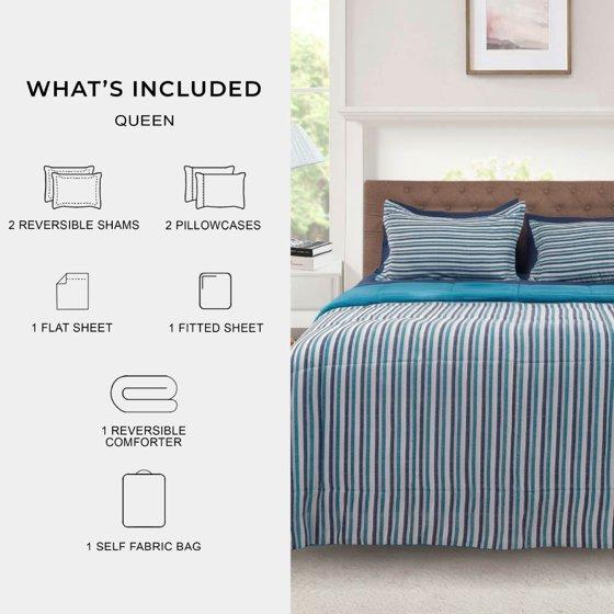- Mainstays 7 Piece Reversible Bed in a Bag Comforter Set with Sheets, Blue and White Stripe, King