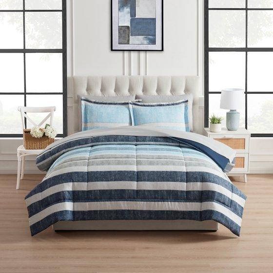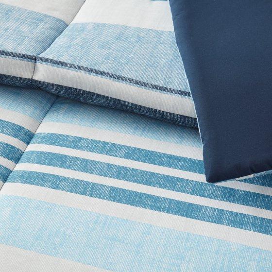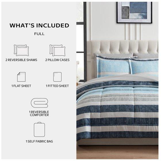Mainstays All in One Reversible Comforter and Sheet set- 7 Piece, Full, Blue Stripe