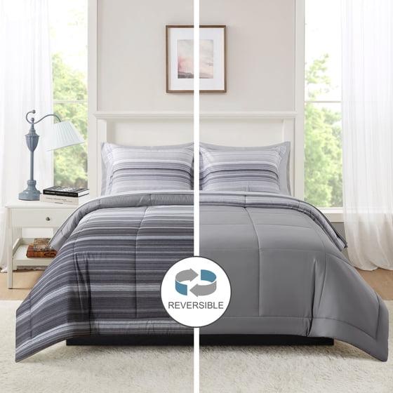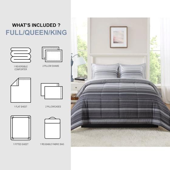 Mainstays All in One Reversible Comforter and Sheet set- 7 Piece, Queen, Gray Stripe