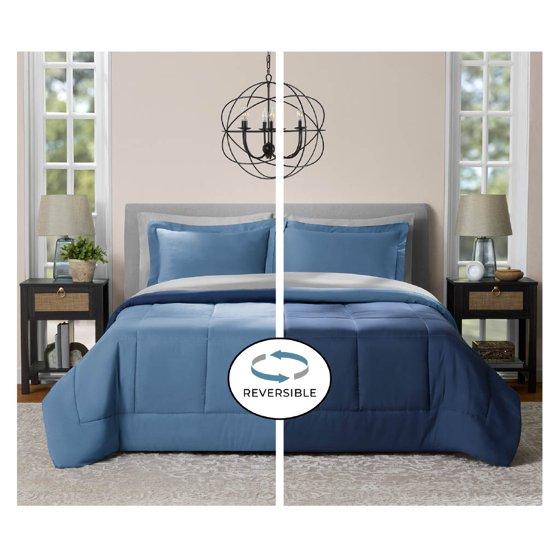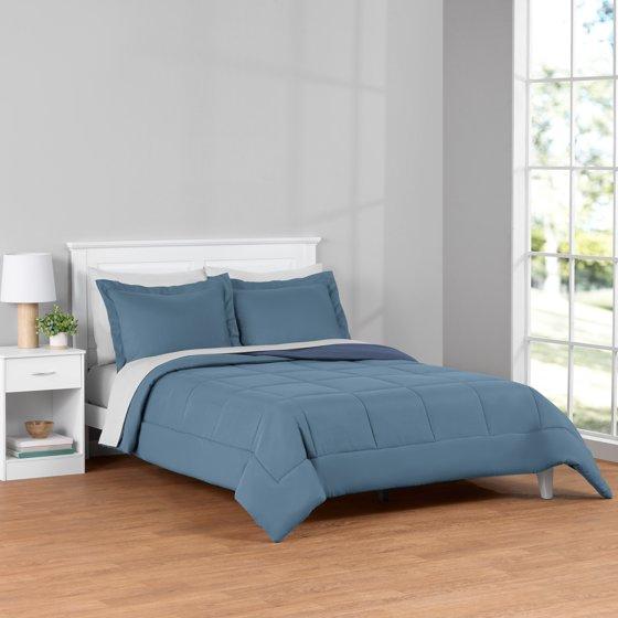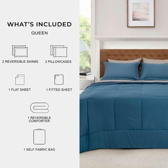 - Mainstays 7 Piece Reversible Bed in a Bag Comforter Set with Sheets, Blue, Queen