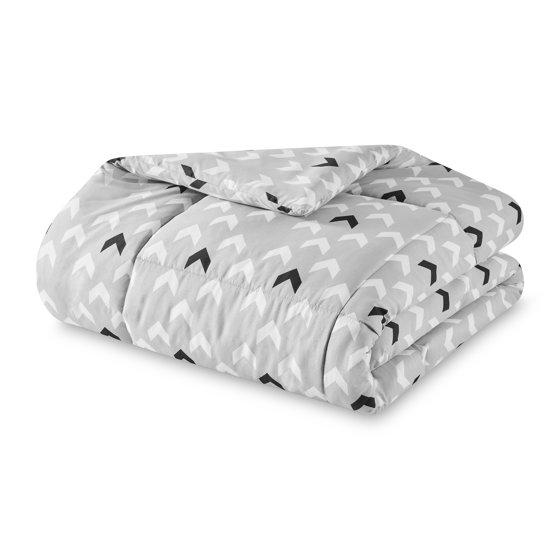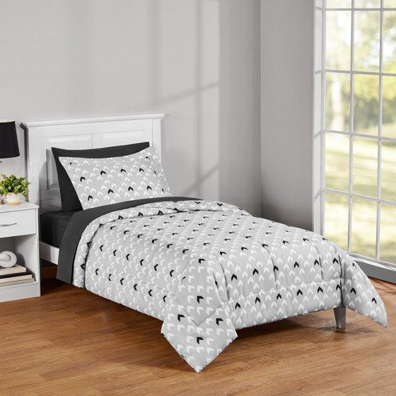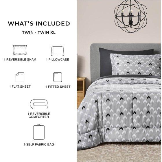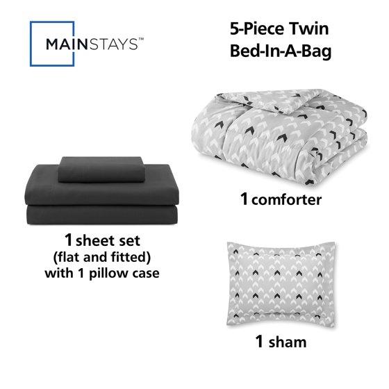 - Mainstays 5 Piece Reversible Bed in a Bag Comforter Set with Sheets, Grey, Black, and White Chevron, Twin-XL