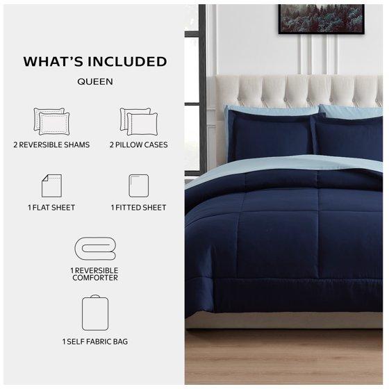 Mainstays All in One Reversible Comforter and Sheet set- 7 Piece, Queen, Navy