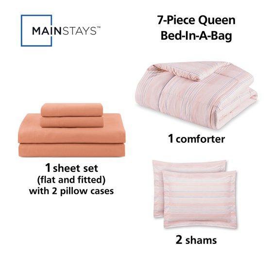 - Mainstays 7-Piece Reversible Country Stripe Pink Blush Bed in a Bag Comforter Set with Sheets, Queen, Adult, Unisex