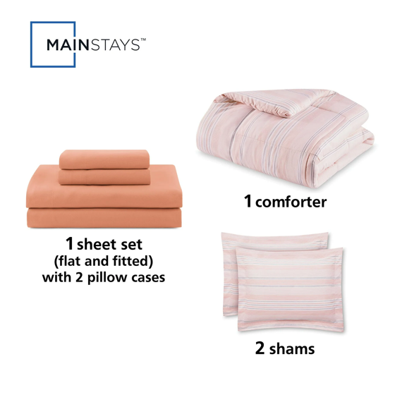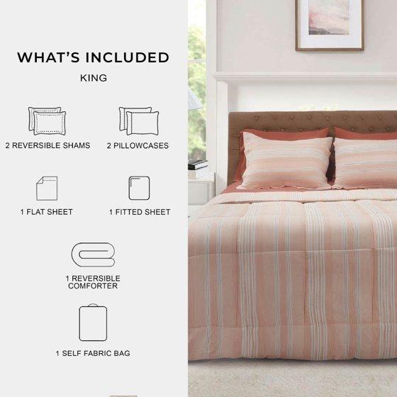 - Mainstays 7-Piece Reversible Country Stripe Pink Blush Bed in a Bag Comforter Set with Sheets, King, Adult, Unisex