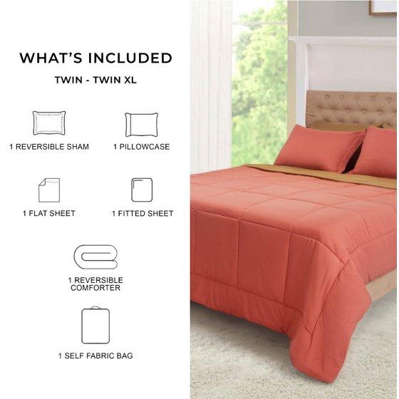 Mainstays All in One Reversible Comforter and Sheet Set- 5 Piece, Twin, Red Canyon