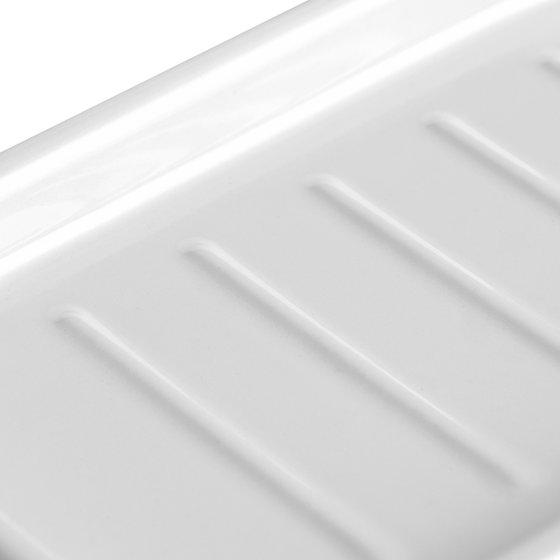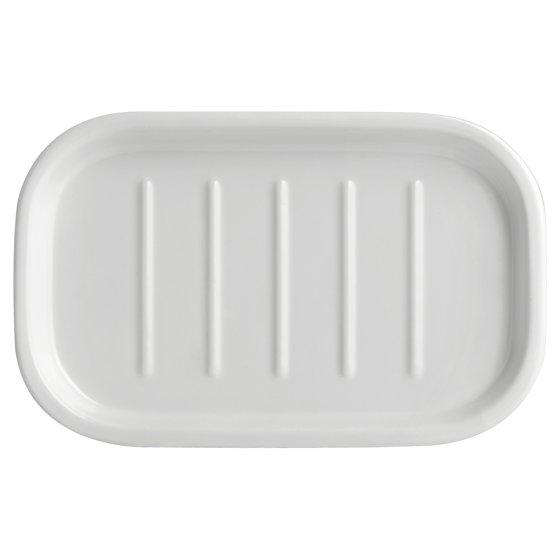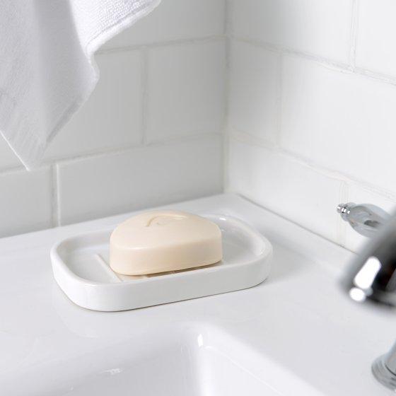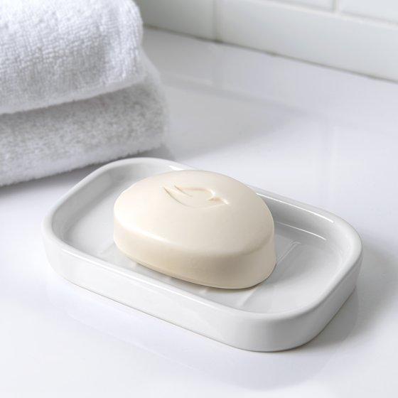 - Ceramic Soap Dish in glossy white offers understated style and functionality