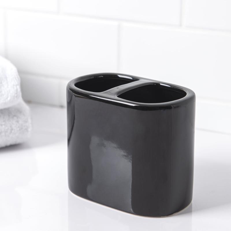 - Ceramic Toothbrush Holder in glossy black offers understated style and functionality
