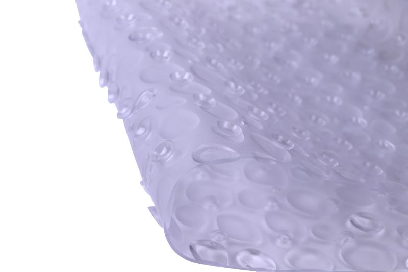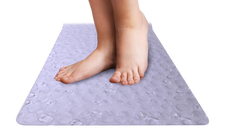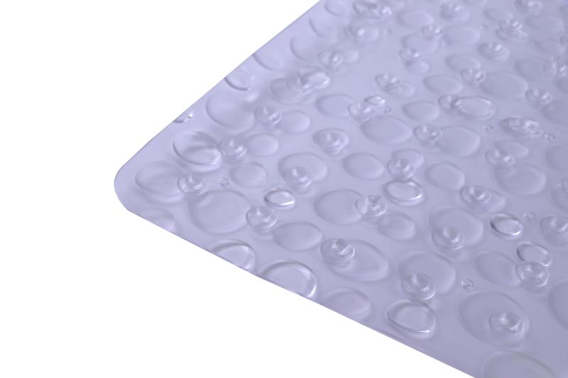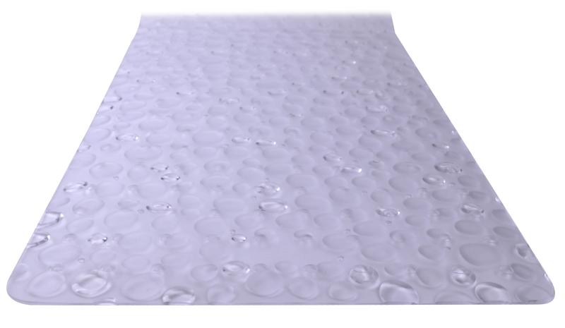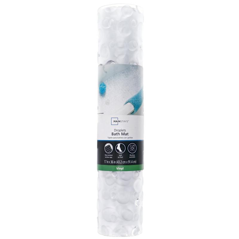 Add a layer of style, safety, and comfort to your bath tub with the Mainstays Droplets Clear Vinyl Tub Mat. This durable mat is equipped with plenty of suction cups to keep the mat from moving around when applied to clean, non-textured surfaces. This tub mat's droplets design provides a luxurious feel on your feet while use in the shower or bath tub. Doubling as an understated design element, this droplets mat effortlessly pairs with any bathroom decor. The slip-resistant design provides for a more secure shower and bath experience for everyone in your home, young and old. Sized at 17"x36" this mat is a perfect fit in almost all bath tubs. Cleaning is easy, too, simply machine wash and hang to dry