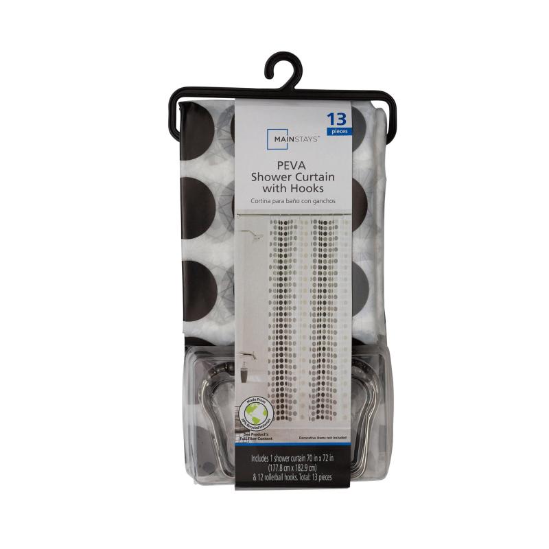 Mainstays Eco-friendly Waterproof Recycled PEVA Black & White Contemporary Polka Dots Shower Curtain Set and 12 Hooks, Black, White