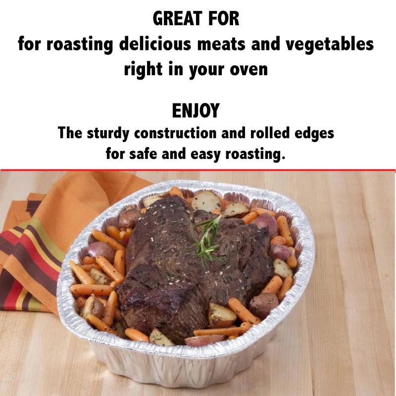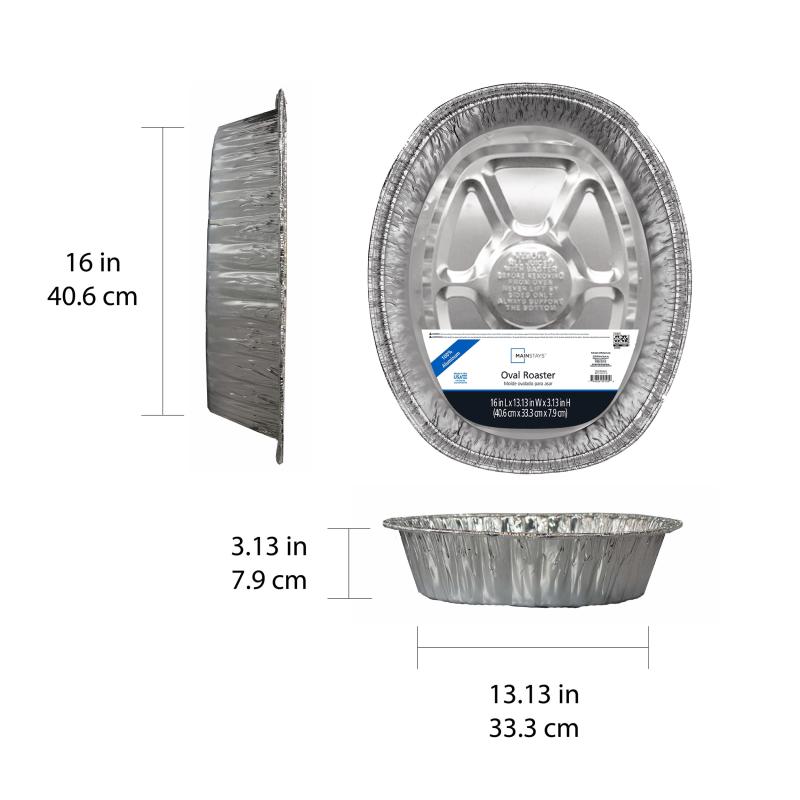 Add convenience and performance to your kitchen pantry with the Mainstays Giant Oval Roaster. Each package includes one pan, item number 9105. It is made of aluminum for quick and even heating to give you great results every time. The pan dimensions are 16-inches long x 13.13-inches wide x 3.13-inches deep. The generous sized pan is ideal for large roasts, glazed ham, roasting chickens and turkeys with room left for vegetables too. The deep side walls keep your food and juices in the pan where it belongs. Remember to support the bottom of the pan when it has food or juice in it to prevent accidents. Use it for your next Sunday dinner, parties or for the holidays. Spend more time with your family and friends and less time in the kitchen scrubbing pans. This pan is disposable so you can take it to a party and not worry about getting your pan back. Kosher certified by the Orthodox Union.