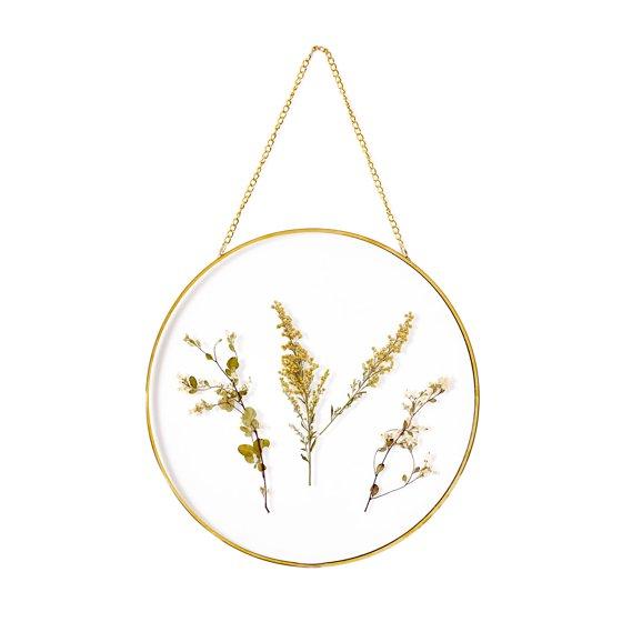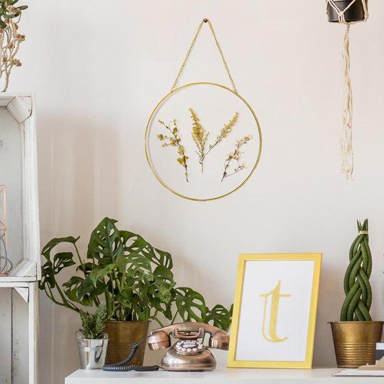 Mainstays Hanging Gold Circular Framed Glass Dried Pressed Floral Wall Decor, 9x9