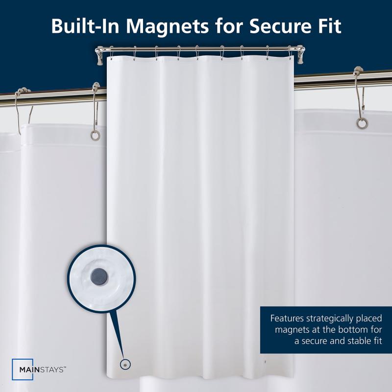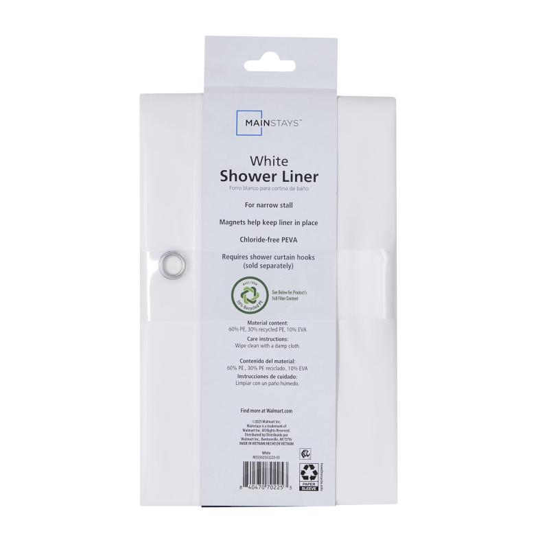 The Mainstays Light Weight PEVA Shower Liner (White) will help keep your decorative shower curtain dry, while keeping water off your bathroom floor. It has a reinforced buttonhole top and enclosed magnets on the bottom to give better support and help prevent bunching and billowing. The liner fits most standard sized tubs and shower areas, and it's easy to hang and works well with standard shower hooks and rods (not included). Choose from clear, frosted, white, and a number of fashionable colors. Whether you are layering this with a shower curtain or using it alone, this piece will be the perfect addition to your bathroom. Simply, wipe clean as needed for easy cleaning. Complete your bathroom with the Mainstays Light Weight PEVA Shower Liner.